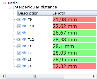 Kết quả của các phép đo đều được hiển thị trực tiếp trên Mô hình xương 3D và được ghi lại trong danh mục dữ liệu. Các phân tích dựa trên phạm vi thông thường và độ lệch dương/âm được đánh dấu bằng các màu tương ứng.