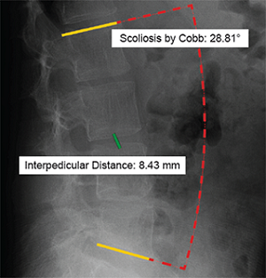Tự động đo các chỉ số cong vẹo cột sống theo COBB /Ferguson, các chỉ số về tình trạng quá ưỡn, gù và độ rộng ống sống.