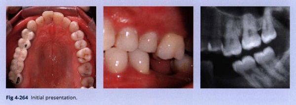 Bệnh nhân này có một răng hàm lớn thứ nhất hàm dưới bị mất và một răng hàm lớn thứ nhất hàm trên trồi xuống (Hình 4-264).