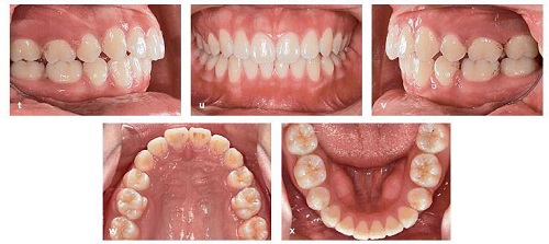 Hồ sơ trước xử lý. Bệnh nhân có một sai khớp cắn loại II với hàm trên và hàm dưới nhô trước và chen chúc ít