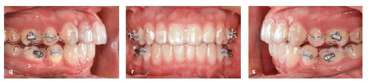 Hồ sơ tiến độ tại tháng 14 với khoảng nhổ răng được đóng lại. Một số tipping phía gần của răng hàm lớn thứ nhất được thấy. (p) Tiến hành chụp phim toàn cảnh panorama cho thấy các răng hàm lớn thứ nhất đã tipping về phía gần vào vị trí nhổ răng.